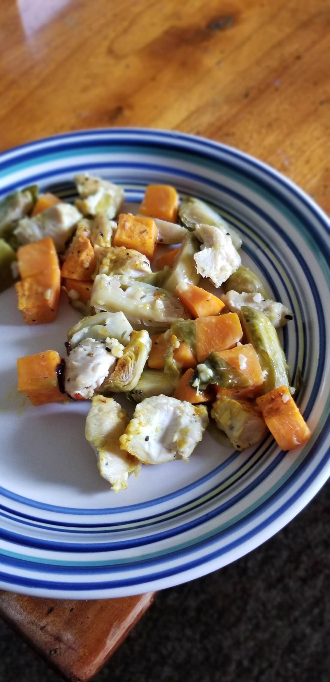 Made diced chicken with sweet potatoes and Brussels sprouts tossed in homemade green goddess sauce. I add turmeric in almost all my recipes. It doesn’t add any flavor and it is good for inflammation. I will post the recipe for the green goddess sauce in another post.