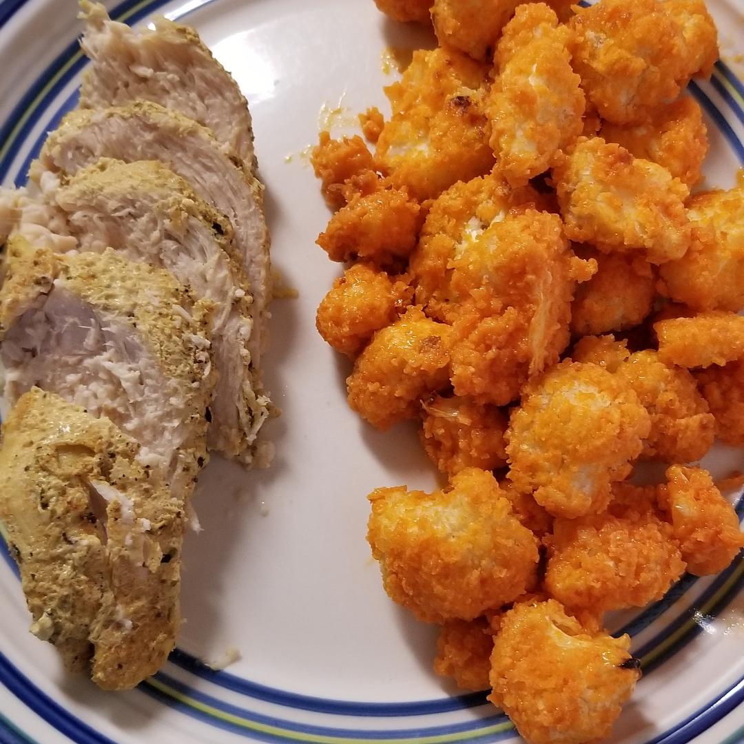 Cut cauliflower into bite size pieces like in the picture too big they will not cook all the way In a large ziploc bag ( or big bowl) mix milk, flour, garlic powder and salt and pepper to taste.close bag and squish around until mixed (or stir if in a bowl) Add all cauliflower to bag and squish around until fully coated set aside in another bag add the panko prepare pans wipe with oil or leave as is. I leave mine it browns them better make sure you have enough space for all the cauliflower. Even if you don’t eat it this time you still need to bake. squish the batter and cauliflower around again In a strainer pour the cauliflower and batter into it. let drain a bit do not shake to remove pour into the panko bag and roll around separate on pans. try to keep from touching or staking bake 15 min then flip them the best you can. bake another 5 to 10 min. until a fork goes in easy and they feel soft when they are done option to toss all in buffalo sauce or toss some in a bit of sauce or serve with sauce on the side. A little goes a long ways with this sauce.
